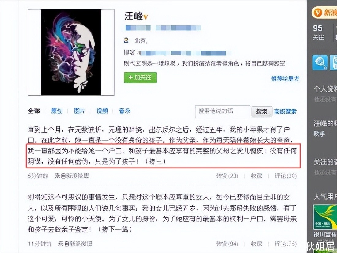 事后,汪峰解释此举仅为解决户口难题:“作为父亲,我每天看着她长大,却无法给予她应有的身份,内心充满愧疚!没有算计,没有表演,只为让孩子拥有基本的权利!”